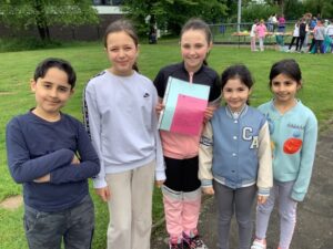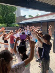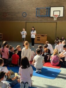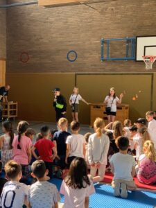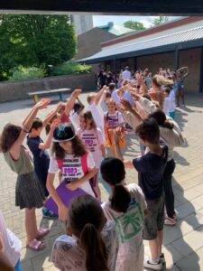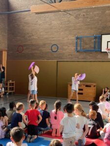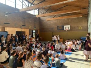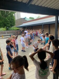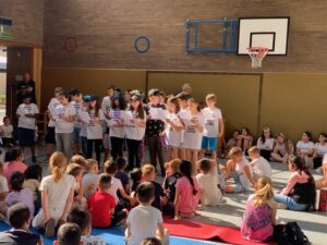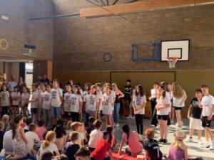 Nach einem gemeinsamen Gottesdienst trafen sich alle Kinder, Lehrer, OGS-Mitarbeiter sowie einige Eltern in der Turnhalle um die beiden vierten Klassen zu verabschieden. Traditionell verabschieden sich die 4. Klässler mit einem bunten Programm bei allen anderen Kindern und Lehrern, dass sie für sie einstudiert haben. Zwei Moderatorenkinder führten durch’s Programm und kündigten uns Trommeleinlagen, Witzeerzähler, Tanzgruppen, Rapper und einen Chor an. Durch einen Spalier, den alle Kinder bildeten, bejubelten sie am Ende des letzten Schultages die 4. Klässler und „schmissen“ sie aus der Schule raus :-).